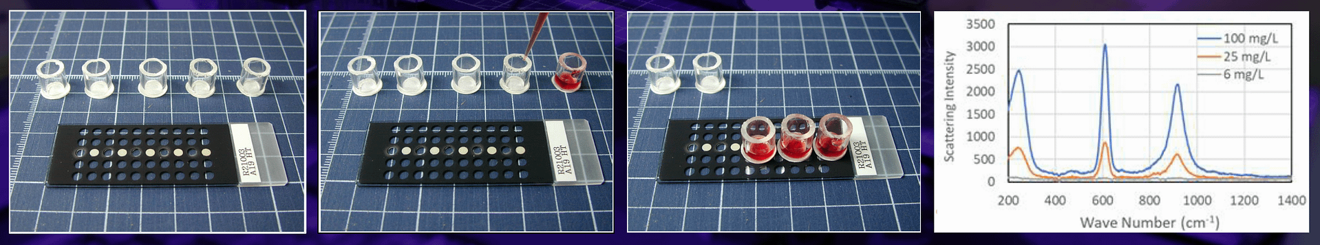 In normal SERS measurements, the object to be measured is dropped onto the surface of a SERS substrate, but we have prepared the following types of SERS: (1) A rod-shaped substrate that can be easily immersed in a small amount of liquid; (2) A press-type substrate that can directly measure substances adsorbed on its surface; (3) A pre-concentration substrate that is suitable for trace amounts and low-concentration aqueous solutions. In addition, because measurements can be made from the back side of the glass substrate, it is also suitable for real-time detection in flow systems.